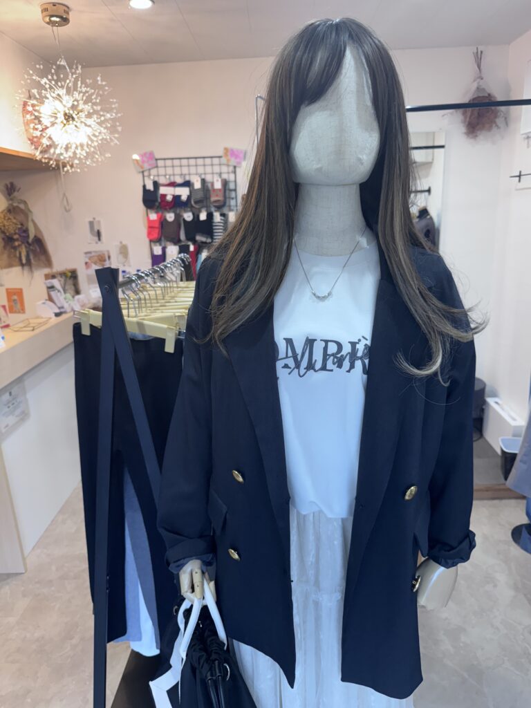 家にあるアイテムや今着ているコーデを聞いて、どんな服が合うか一緒に考えます。ネットでも服は買えますが、質感や細かなシルエット、手触りまでは分かりません。お店で実際に手に取りながら、お気に入りの一着を見つけてみませんか?